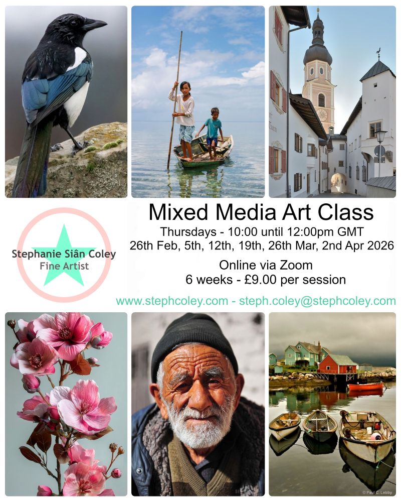 Course description: During February, March and April Steph will be running 6 weekly mixed media art classes. All of these sessions will take place online via Zoom. All ages & abilities are welcome. Subject matter and art materials will vary throughout the course. Each week Steph will select a suitable photographic image to work from and she will try to vary these as much as possible. She’ll email everyone the image prior to each class, so that people can print this out or get it displayed onto another device if possible. Each week Steph will also share what art materials she’ll be working with during the class. Again these will vary. People can then either select the same art materials as Steph, or use something entirely different. It’s often really interesting when people work on the same subject matter in a variety of different mediums.